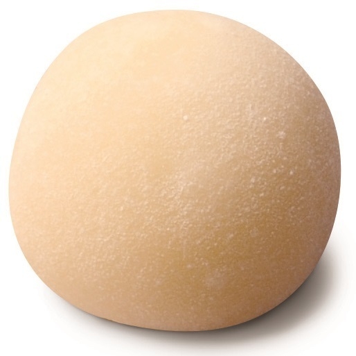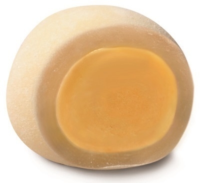 「ぐでたまのおもちキャラメルプリン味」は、たまごの殻をイメージさせる白いもちもちのおもちでたまごの黄身をイメージさせるキャラメルプリン味のガナッシュを包みこみました。