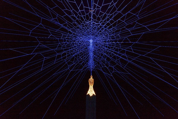 生命科学、自然現象、哲学の視点を織り交ぜながら発表を続けている作者が滞在制作した作品です。六甲山は霧が非常に多く発生することから、当作品では大気光学現象のブロッケンをテーマにしています。光輪とも呼ばれるこの現象は稀に高山などで見られ、人物などの影が霧や雲に投影される際に中央の影の周りが虹のように光るものです。中央には表面を残して薄くくりぬかれた人型の木彫りがあり、周囲には二進法により定められた手順で0.2mmの絹糸が張り巡らされています。絹糸はかつて神戸において重要な輸出産業であったことから選ばれた素材です。