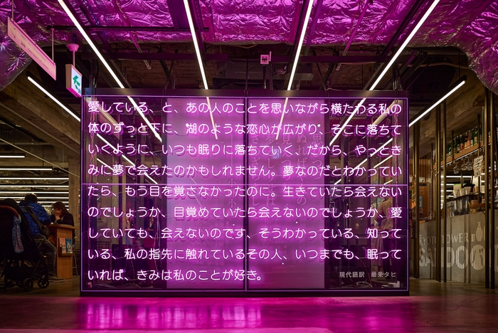 詩人・最果タヒ氏が、古今和歌集や新古今和歌集などの古の和歌を現代語訳した詩などを、パブリックアートとして館内各所に展開。最果タヒ氏の詩集などをデザインしている佐々木俊氏が監修。館内を歩いているふとした瞬間や、席で食事をしながら「ことば」と出会い、『詩を一服』して過ごしてもらう。そんな、京都を旅する中のひと時を彩る体験を提供します。