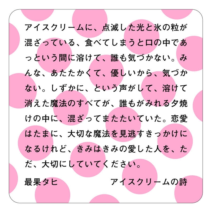 京都タワーサンド B1F FOOD HALLの一部店舗と大垣書店&CAFE イオンモール北大路店にて、最果タヒ氏の新刊出版を記念したオリジナルメニューを販売いたします。各メニューにはオリジナルコースターとピック付き(詩:最果タヒ氏書きおろし・各種デザイン:佐々木俊氏)。