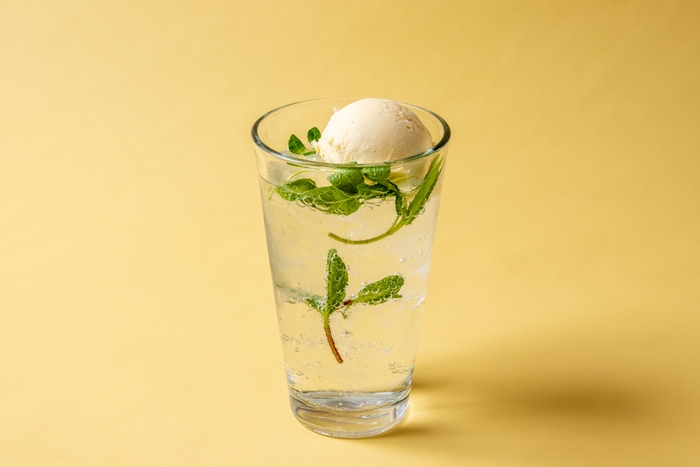 ミントの緑色で無人島を、透き通ったソーダで水を表現し、新刊『無人島には水と漫画とアイスクリーム』をイメージした1杯です。ラムシロップとミントでヴァージンモヒートのような味わいをお楽しみください。