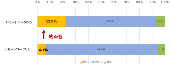 コロナ禍での勤務形態について、週に1日以上リモートワークを行う割合は約6割であり、「資料や契約書などを翻訳する際、自身で翻訳する頻度が増えた」と答えた人は、リモートワークをしている人の方が、していない人と比較して約4倍も多い結果となりました。