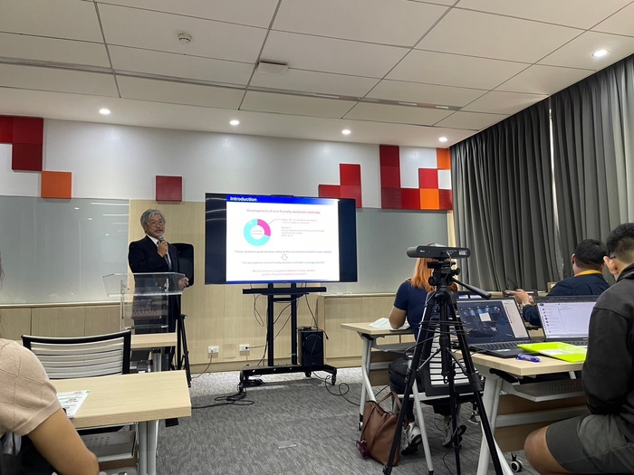 18日午前のコロキウムでは、理大側からフロンティア理工学研究所の赤司治夫教授が、金属錯体を触媒に使って有機物を酸化する反応について説明したほか、理学部物理学科の山本薫教授、同研究所の岩井良輔講師が最新の研究成果を報告。マプア大学側からも2人の教員が研究成果を披露しました。OUS研究者ナビゲーターの使い方などの紹介にも大きな反響があり、今後の学術交流の活発化が大いに期待されました。