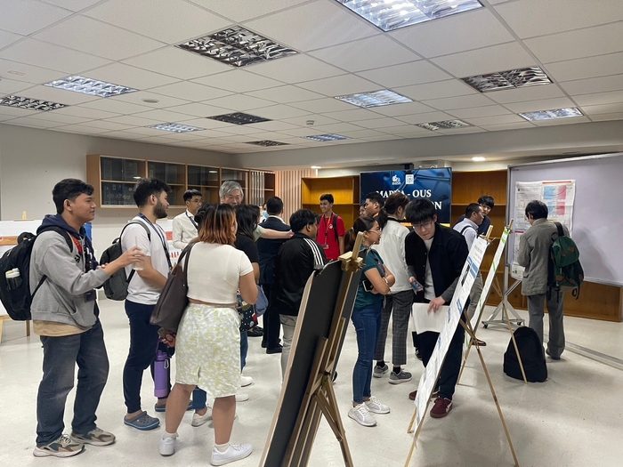 午後には学生たちのポスターセッションがあり、理大大学院理学研究科修士課程の中島しのさんが、抗がん剤の材料として注目されている金(Au)のポルフィリン錯体を合成し、その性質と構造について発表するなど、理大側は計5人、マプア大学側は7人の学生がポスター発表し、熱心に意見交換しました。