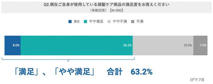 満足度に関する設問では、実際に使用している「頭髪ケア商品」について、過半数の63.2%が満足に類することがわかりました。