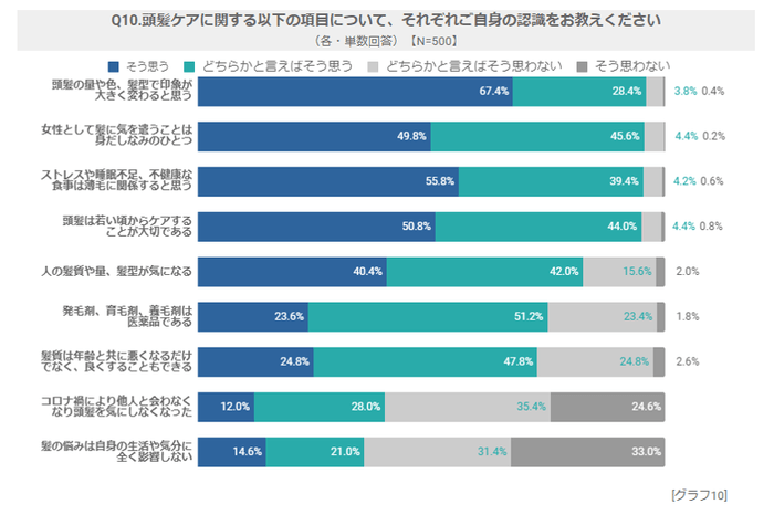 頭髪や頭髪ケアに関する意識の設問では、95.8%*が「頭髪の量や色、髪型で印象が大きく変わる」と思っていると回答。95.4%*が「女性として髪に気を遣うことは身だしなみのひとつ」、「髪の悩みは自身の生活や気分に全く影響しない」という設問については、64.4%**が「影響する」と回答しています。