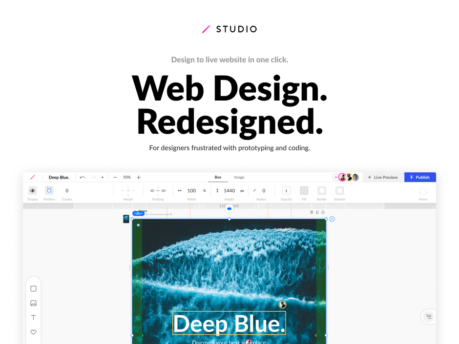 STUDIOは、作成したデザインをそのまま実際のWebサイトとして公開することを可能にした、全く新しいデザインツールです。2018年4月に正式版をリリースし、約5万人のユーザーを獲得、ユーザーの海外比率は40%を超えてグローバルに愛されるサービスに進化しています。