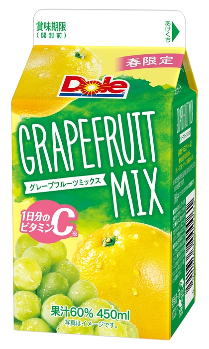 グレープフルーツの「すっきり」「さっぱり」とした風味は、気分転換をしたい時に飲まれています。『Dole(R) GRAPEFRUIT MIX 』は、春バテを感じる春の季節の気分転換時に飲んでいただけるよう、グレープフルーツの苦みを残しつつ、白ブドウをブレンドして、すっきり飲みやすい風味に仕立てました。疲れた体にうれしいビタミンCを1本(450ml)で1日分※1 配合しています。