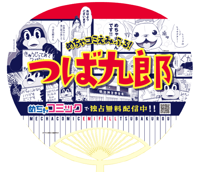 当日は、来場者先着20,000名様に、つば九郎とめちゃ犬のめちゃコミックオリジナル漫画『めちゃコミえみふる!つば九郎』(ヤクルト球団・小鳥遊ゆりか)のイラスト等が入った特製うちわを配布します。