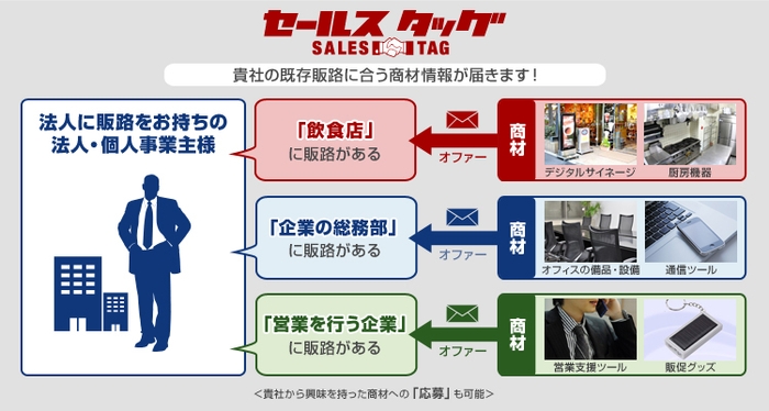 既に営業販路を持っている法人・個人事業主の方が企業情報や販路情報を登録して頂くと、その登録情報に基づき、商材を持つ企業から販路に合った商材のオファーをセールスタッグでお届けします。
