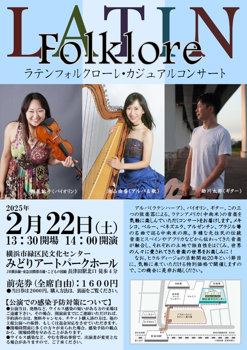 アルパ(ラテンハープ)、バイオリン、ギター、この三つの弦楽器による、ラテンアメリカ(中南米)の音楽を気軽に楽しんでいただくコンサートをお届けします。メキシコ、ペルー、ベネズエラ、アルゼンチン、ブラジル等の名曲で巡る中南米の旅。多様な先住民の伝統音楽とスペインやアフリカなどから伝わってきた音楽が融合し、それぞれの土地で独自性をはぐくみ、世界の人々に愛されてきた音楽の世界をお楽しみに!