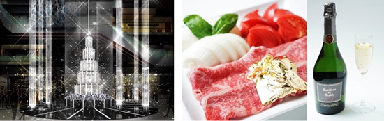 【左】メインクリスマスツリー「Sparkling Ray」 【右】金箔を使ったメニュー「Sparkling Christmas Menu」