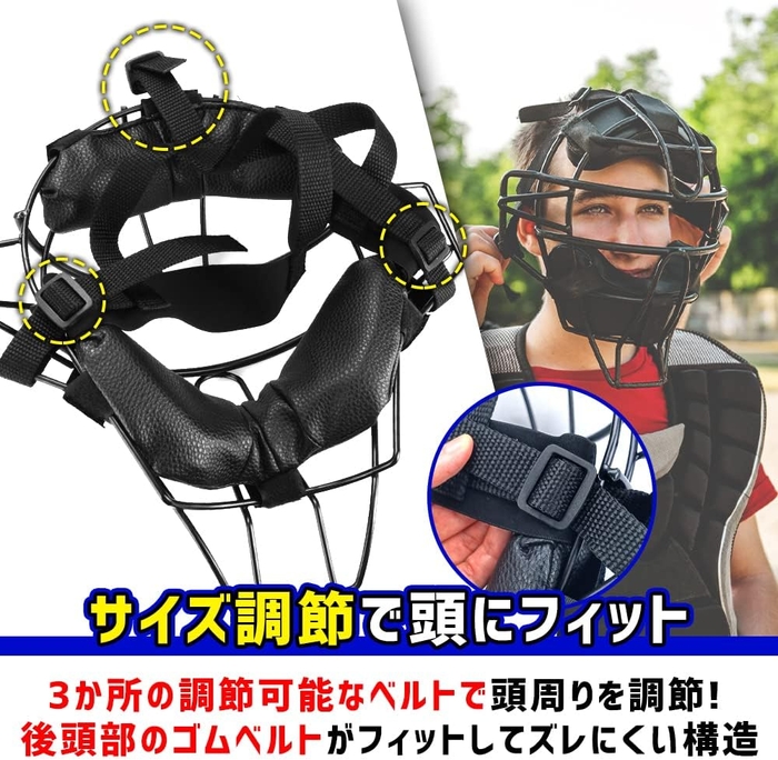 キャッチャーマスクの上部と左右にあるベルトは、長さを変えられる仕様により使う人によってサイズを細かく調整できるため男女兼用で使用可能です。後頭部をしっかり固定することでプレイ中にズレる心配がありません。練習から試合まで幅広いシーンでお役立ていただけます。
