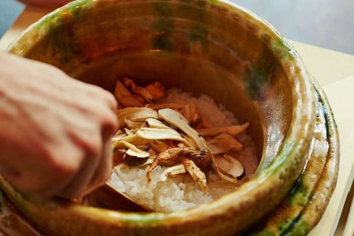 星のや軽井沢のメインダイニング「日本料理 嘉助」にて、「きのこの特別鍋会席」を用意します。メインは「きのこと牛肉のしゃぶしゃぶ」。きのこから出る深みのある出汁で肉を味わう、きのこの旨味が主役の料理です。その他、先付けではシャキシャキとした食感を、椀代りではきのこの香りを楽しめるなど、その時期に採れたきのこを使い、料理ごとに異なる味わいや食感が楽しめる献立です。