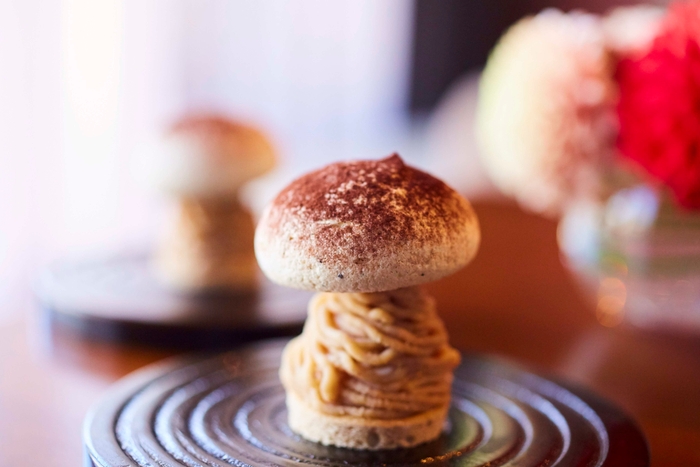 ウェルカムスイーツは、隣接する「軽井沢ホテルブレストンコート」のパティシエが作る、きのこのモンブランです。パウダー状にしたきのこをシャンティイクリームとキャラメルメレンゲに加えているため、口に入れるとほのかにきのこの香りが感じられます。椎茸の形をイメージして作られたスイーツで、見ても食べても楽しめます。
