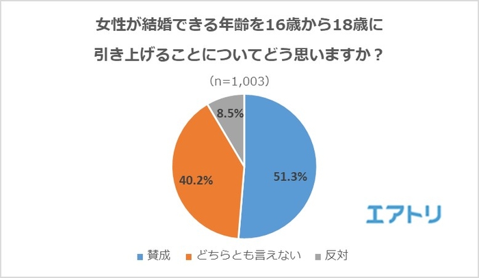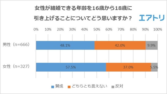 過半数が「賛成」と回答。女性は男性よりも「賛成」の割合が高くなりました。「賛成」の人からは「男女で差がある理由が見当たらない」「進学して、社会に出て自分で意思決定できるようになってから結婚を選択すべき」、「反対」の人からは少子化を危惧する声が多く聞かれました。