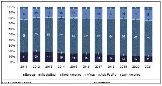 ラテンアメリカ、アフリカおよび中東は、世界の軍事シミュレーション支出のなかで、それぞれ4.3%、1.2%そして0.8%のシェアとなるでしょう。