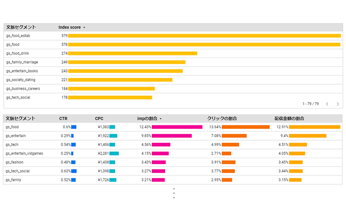 配信結果に対して、各コンテクスチュアルターゲティングの標準セグメント毎に、CTR/CPC/Imp割合/クリック割合/配信金額割合/Index Score(※)