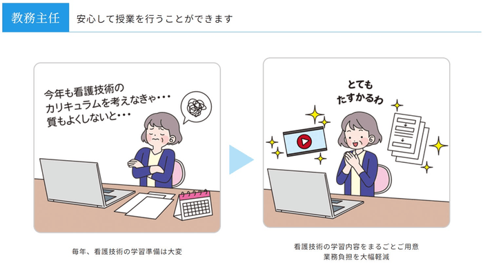 そして、本サービスは看護学生・教員・教務主任、それぞれの立場で役立つように設計されており、看護学生にはしっかりした学習をサポート、教員へは学生の指導に役立てられるように設計、そして教務主任の皆さまには安心して授業を行っていただけるようなコンテンツとなっております。