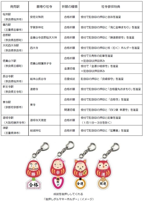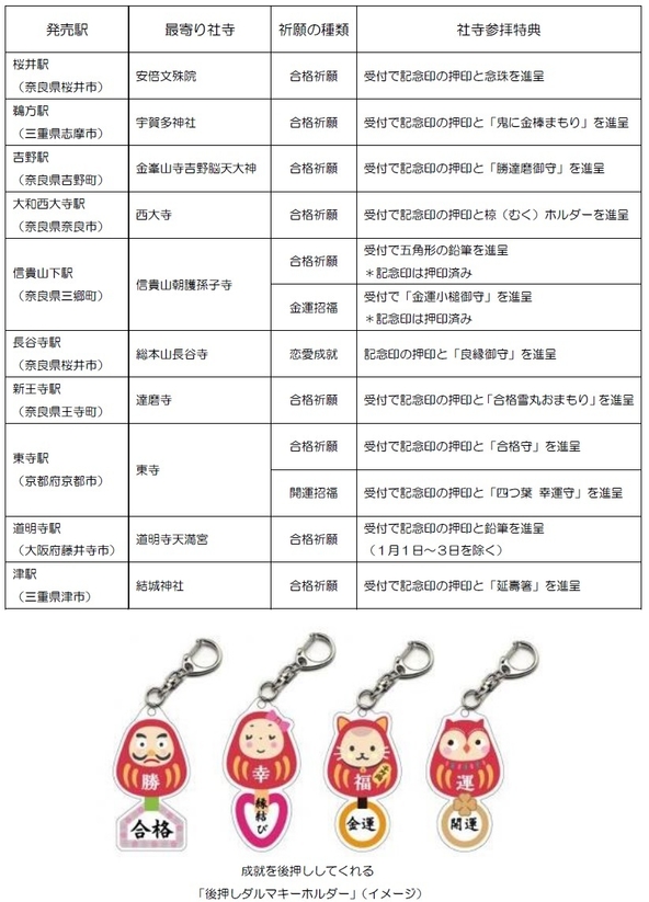 本年は、三重県の神社にも新たにご協力いただき、沿線の10社寺【安倍文殊院(奈良県)、宇賀多神社(三重県)、金峯山寺吉野脳天大神(奈良県)、西大寺(奈良県)、信貴山朝護孫子寺(奈良県)、総本山長谷寺(奈良県)、達磨寺(奈良県)、東寺(京都府)、道明寺天満宮(大阪府)、結城神社(三重県)《五十音順》】のご協力で、大阪府、京都府、奈良県のほか実施エリアを拡大して三重県や愛知県の路線でも運行します。