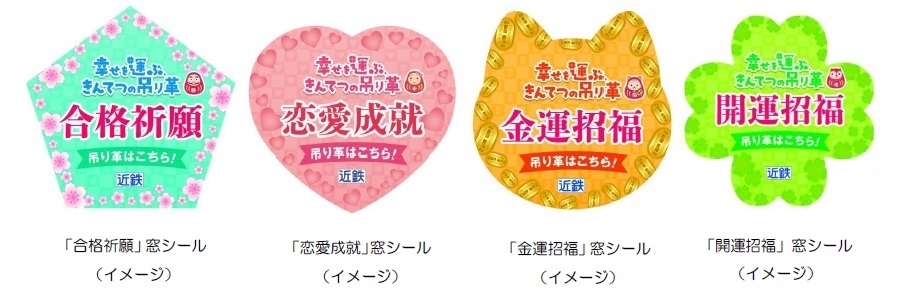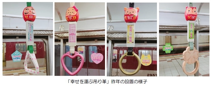 特別な吊り革は、桜模様を施した五角形の合格祈願吊り革(99本)、ハート型の恋愛成就吊り革(3本)、ゴールドの輪の金運招福吊り革(1本)、クローバー型の開運招福吊り革(4本)の4種類で、約430編成ある車両のうち107編成に1編成あたり1本ずつ設置します。