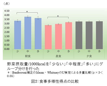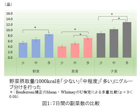 各食事での副菜数が多い場合と、朝食・昼食のメニューに多様性が見られる場合、野菜の摂取量が多かった(図1)。