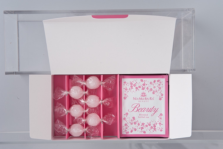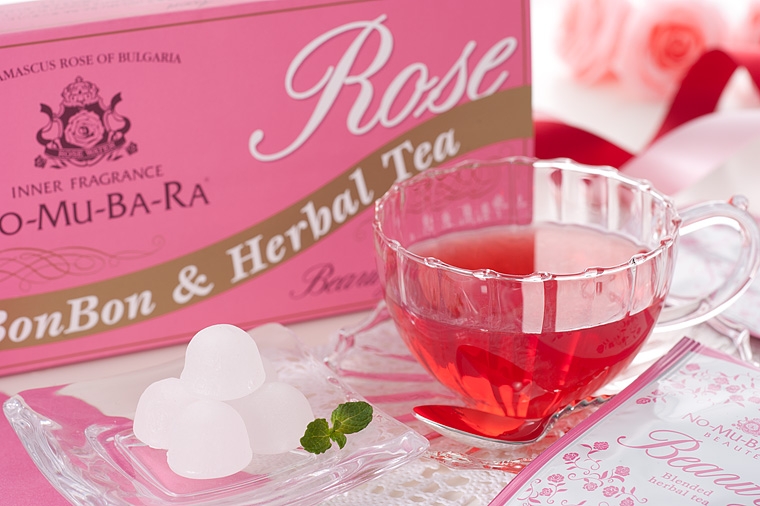 世界最高級品質のローズオイル・ローズウォーターの産地ブルガリアで唯一国際オーガニック認定機関IMO社の認定を受けたバラ園を持つ「エニオ・ポンチェフ社」の無添加ローズウォーター「NO-MU-BA-RA」を使用し昔ながらの製法で手作りした砂糖菓子「NO-MU-BA-RAボンボン」とと、ノンカフェインのルイボスティーをベースにバラやローズヒップ、ハイビスカスなどをブレンドした「NO-MU-BA-RA BEAUTE Beauty」のアソートセット。