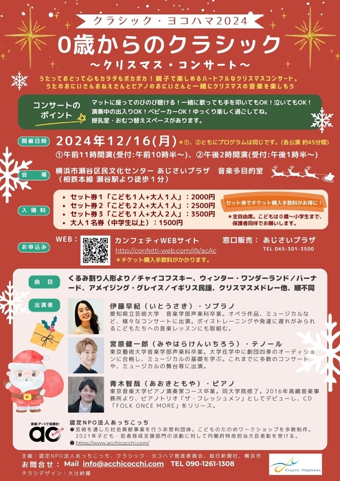 認定NPO法人あっちこっち、クラシック・ヨコハマ推委員会、毎日新聞社、横浜市主催、『0歳からのクラシック~クリスマス・コンサート』が2024年12月16日 (月)に横浜市瀬谷区民文化センター あじさいプラザ 音楽多目的室(神奈川県 横浜市瀬谷区 瀬谷 4丁目4番地10(ライブゲート瀬谷3階・4階))にて開催されます。
