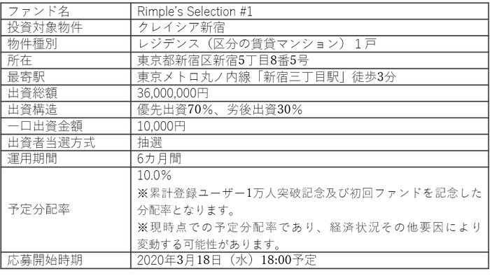不動産投資型クラウドファンディングRimple(リンプル)初回ファンド(Rimple’s Selection#1) “予定分配率10.0%” 決定のご案内