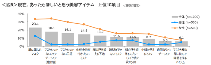 【新しいニーズ】不満もある一方で、コロナ禍でも美容に満足していることは「マスクで顔を隠せること」が男女ともにTOP。<図4>また、あったらほしいと思う美容アイテムについては「肌に優しいマスク」が23.4%と最も多い結果となった。続いて「マスクにつかないファンデーション(色つき)」「マスクにつかないリップ」と続き、美容アイテムのほうに改善を求める声が多かった。<図5>美容費は抑える傾向にあり不満もうかがえるものの、その不満を払しょくできる美容アイテムには関心があると考えられる。