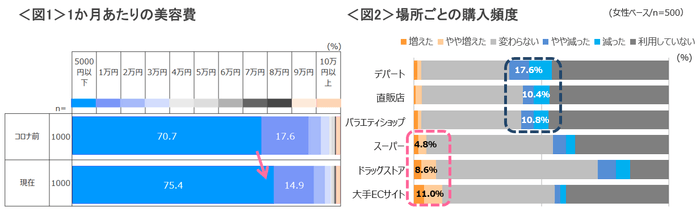 【行動変化】1か月あたりの美容費をコロナ前と現在とでそれぞれ聞いたところ、コロナ前と比べて美容費は抑える傾向に。コロナ前は「5000円以下」という人が全体で70.7%だったが、現在は75.4%となった。<図1>女性の美容アイテムの購入場所について、「ドラッグストア」「スーパー」「大手ECサイト」はコロナ後の利用が増加しており、一方で「デパート」「直営店」「バラエティショップ」は減少している。特にデパートでは2割弱の人が「減った・やや減った」と回答しており、店頭でのタッチアップができないことや営業時間の短縮などが影響していると考えられる。<図2>
