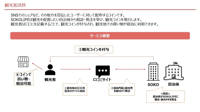 具体的には、SNS や旅行サイトにて、対象自治体の口コミを投稿してくれた方々にコインを配布することで、観光に繋げていきます。