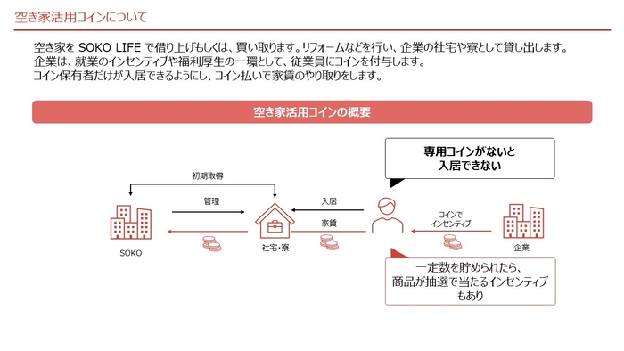 空き家を SOKO LIFE TECHNOLOGY にて、買い取り、もしくは借り上げを行い、企業の寮や社宅として貸し出します。