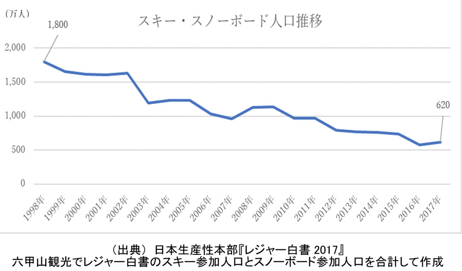 長らく減少傾向をたどってきたスキー人口は2013年以降、横ばいで推移し下げ止まっています。2016年は天候の影響もあってか、前年より150万人減少しましたが、天候の安定した2017年は微増しました。一方、スノーボードは2013年以降、概ね横ばいで推移しています。