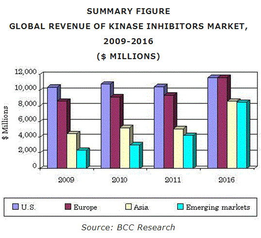 新興国のキナーゼ阻害剤市場は2010年に29億ドルに、2011年には41億ドルに、そして2016年には15.2%のCAGRにて84億ドルに到達すると予想されています。