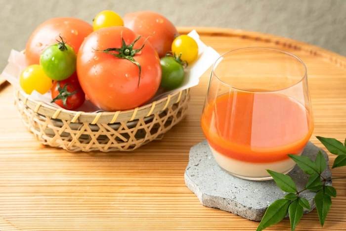 朝のお目覚めの一杯に、「トマト甘酒」を飲みフレッシュな気分で1日を始めます。トマトに含まれるリコピンは朝に摂ると1日の中で吸収が良いとされており、夏の外出時に気になる紫外線の対策にも繋がります。米麹が発酵することで栄養価の高い飲み物と言われている甘酒と、濃厚ながらもさっぱりしたトマトジュースを合わせた「トマト甘酒」で水分を補給した後の湯浴みは、身体の代謝を上げることが期待できます。