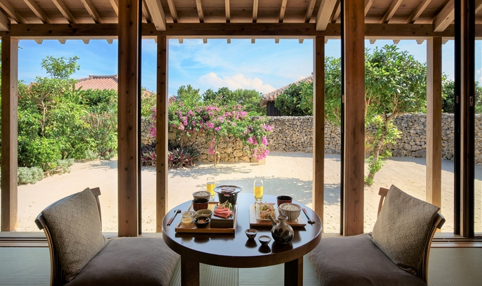 竹富島の伝統建築様式を尊重した戸建の客室は、南風を迎え入れるため縁側は南に向いており、窓を全面開放することで南から北に心地よい風が吹き抜ける設計です。3密のない客室の中では、縁側に座り、真っ白な砂が敷き詰められた庭を眺めながら時間を忘れてゆったりと過ごすことができます。一軒ごとに石垣に囲まれた客室では、密集を避けてゆったりと安心して食事を楽しめます。施設の全景と海を望む「見晴台」で過ごす時間や、南国の草花や屋根の上の表情の異なるシーサーを眺めながらの散策もおすすめです。