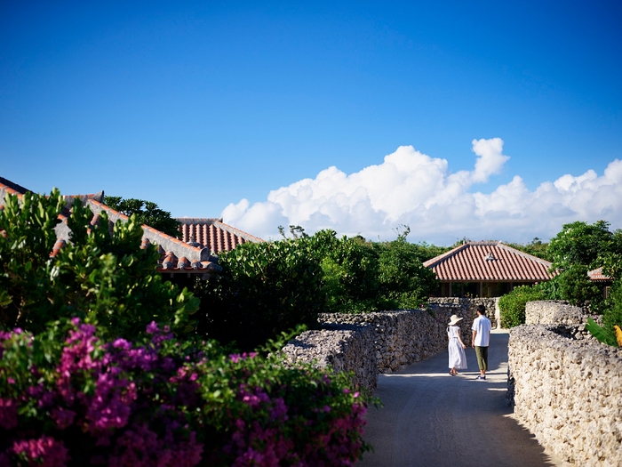 竹富島の東に位置する琉球赤瓦の集落「星のや竹富島」。約2万坪の敷地には、島内の家々と同じように伝統を尊重して建てた戸建の客室、白砂の路地、プール、見晴台などがあり、小さな集落が構成されています。