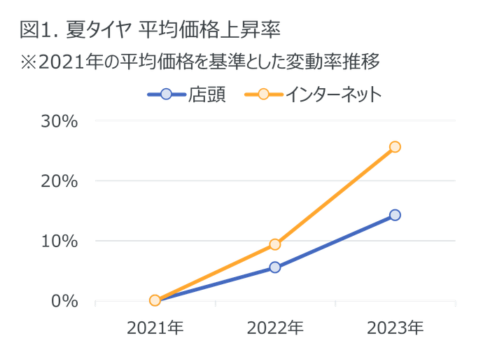 2023年のタイヤ全体の数量前年比は7%減と低調であった。夏タイヤは全体で数量前年比8%減、店頭では数量前年比7%減、インターネットでは同10%減とマイナス成長であった。特に14インチ以下の軽自動車サイズが店頭では数量前年比9%減と減少し、インターネットでは同20%減と大幅に落ち込んだ。夏タイヤの平均価格は店頭では前年から8%上昇し10,782円、インターネットでは15%上昇し9,639円となった。2年連続で価格改定が実施されたこともあり、2021年の平均価格からは店頭で14%、インターネットで26%の上昇となった(図1)。販売数量は減少したものの平均価格の上昇に支えられ、金額前年比は店頭では1%増、インターネットでは4%増と微増となった。