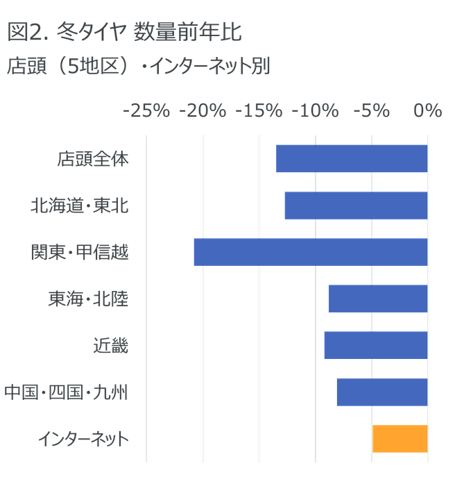 冬タイヤの2023年9-12月期の数量前年比は全体で10%減と二桁マイナスとなった。店頭では数量前年比14%減、特に関東・甲信越では同21%減と前年を大幅に割り込み、インターネットでは同5%減であった(図2)。冬タイヤの最盛期である12月の販売が、数量前年比25%減と著しく減少したことが影響した。冬タイヤの平均価格は店頭では13,123円と前年から7%上昇したことに対し、インターネットではプレミアム製品の構成比が下がったことが一因となり、11,682円と1%下落した。金額前年比は店頭では8%減、インターネットでは2%減となった。