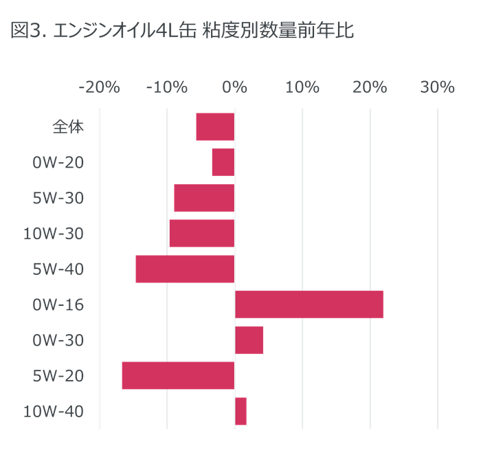 4L缶の主要な粘度では、0W-20が数量前年比3%減、5W-30が同9%減、10W-30が同10%減と減少した(図3)。そうした中、0W-16は数量前年比22%増と二桁成長を見せた他、0W-30は同4%増、10W-40は同2%増と前年を超える粘度も見られた。