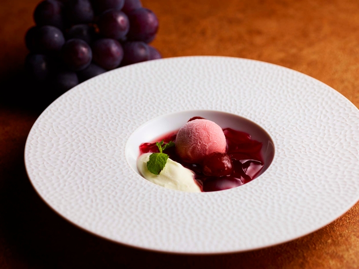 コースの締めくくりはシェフおすすめのジェラートを使ったデザートをご用意いたします。9月中は甘味の強い巨峰のジェラートをアレンジした一皿。赤ワインを煮詰めたジュレの渋味、フロマージュブランの爽やかな酸味との絶妙なバランスをお楽しみください。