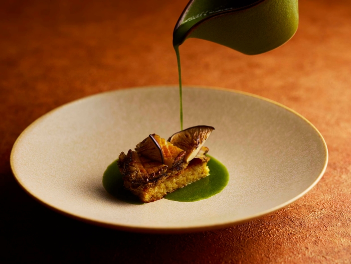 魚料理は鮮やかな緑が目を引く一皿。石窯でふっくらと焼き上げた蝦夷鮑に、程よい苦みのある肝の焼きリゾットを添えました。ほうれん草と浅利のスープをベースにした、燻製の風味豊かなソースをかけてお召し上がりください。