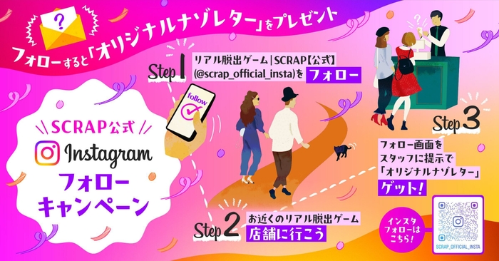 株式会社SCRAP(本社:東京都渋谷区 代表:加藤隆生)は、本日2024年5月21日(火)より、各店舗でリアル脱出ゲーム|SCRAP公式Instagram(https://www.instagram.com/scrap_official_insta)のフォロー画面を提示すると「オリジナルナゾレター」をプレゼントするキャンペーンを開催いたします。