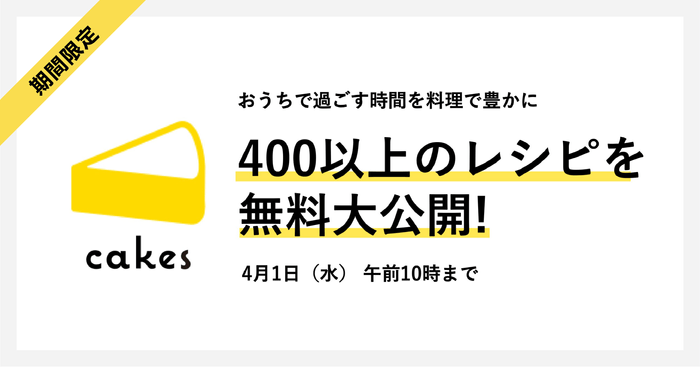 コンテンツ配信サイトcakesは、3月11日から4月1日10時まで6つの料理連載(400以上のレシピ)を無料公開します。おうちで過ごす時間が増えているときだからこそ、おいしいもので毎日のごはんをちょっと楽しくするお手伝いがしたいと企画しました。短時間で作れるもの、じっくり時間と手間をかけて作るもの。さまざまなレシピを、ぜひ試してみてください。