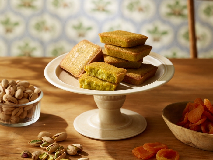 豊かに実ったピスタチオを惜しみなく使用したフィナンシェです。引き立て役はほんのりとした三位のアプリコット。ピスタチオの美味しさを存分に味わってください。
