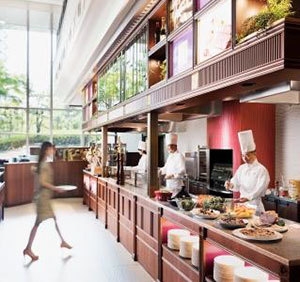 ・“劇場型ライブキッチン”で一皿ずつ提供するメインディッシュに料理コーナーに並ぶ多彩なメニューを組み合わせて“フルコース”を仕立てるようにお楽しみいただけます。