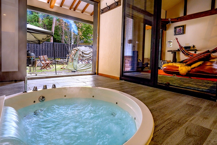 当施設は「冒険心を刺激する遊びの感動体験」を大切にしながら、新しいアウトドア・ラグジュアリーのカタチを目指している山梨県河口湖にある富士山が望めるエリア唯一の施設内で湧き出る源泉 使用 天然掛け流し温泉付きグランピング施設です。