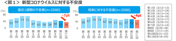 定点指標の【不安度】は、「直近1週間の不安度」・「将来に対する不安度」のどちらも減少し、調査開始以来の最低値を更新。”宣言解除”から1ヶ月が経った6月下旬頃の水準に再び戻った。<図1>