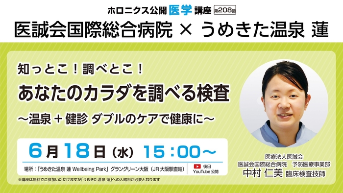 6月18日(水)にはその第2回として、「~温泉 + 健診 ダブルのケアで健康に~」をテーマに、医誠会国際総合病院 予防医療事業部 中村 仁美 臨床検査技師が登壇。誰もが一度は耳にしたことがある“検査”に着目し、「あなたのカラダを調べる検査」について、日常生活との関わりや、気づきにくい病気のサインを解説します。